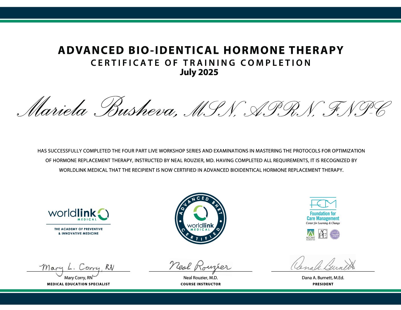 Awarded in July 2025 , the certification is recognized by Worldlink Medical, a leader in preventive and innovative medicine. To achieve this credential, Mariela Busheva successfully completed a rigorous four-part live workshop series and examinations focused on mastering the protocols for hormone optimization. The course was instructed by the renowned expert in the field, Neal Rouzier, M.D.